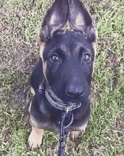 Paglalarawan ng Content: a german shepherd puppy is sitting in the grass on a leash
