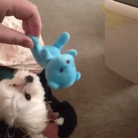 Paglalarawan ng Content: a white dog is playing with a blue teddy bear toy