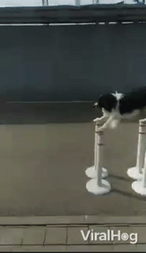 Paglalarawan ng Content: a black and white dog is jumping over a barrier with viralhog written on the bottom right