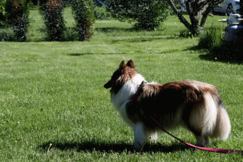 Paglalarawan ng Content: a brown and white dog on a leash stands in the grass