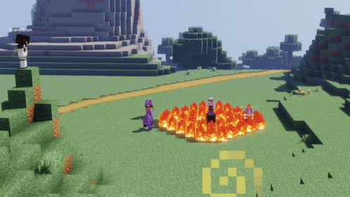 Paglalarawan ng Content: a screenshot of a minecraft game shows a group of people standing around a circle of fire
