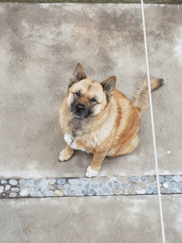 Paglalarawan ng Content: a dog sitting on a tiled floor looking up at the camera