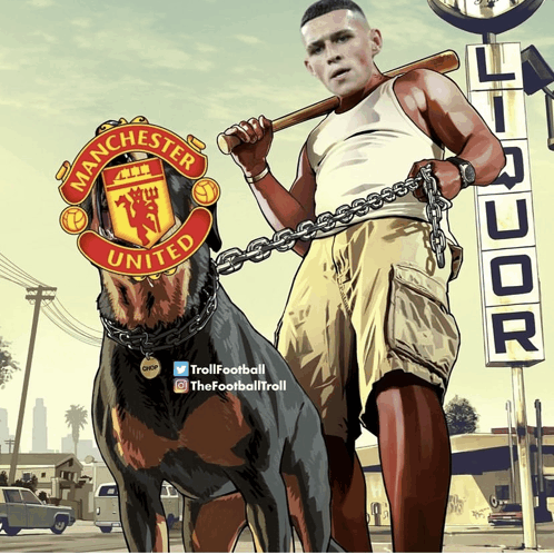 Paglalarawan ng Content: a man is holding a bat while walking a dog with the manchester united logo on it