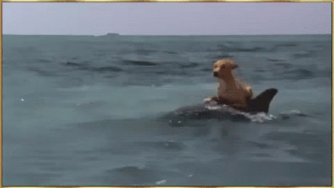 Paglalarawan ng Content: a dog is riding on the back of a dolphin in the ocean