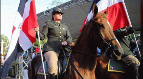 Paglalarawan ng Content: a woman in a military uniform is riding a horse while holding a flag
