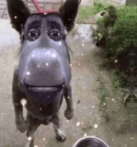 Paglalarawan ng Content: a dog with a face on its head is standing next to a bowl of food .