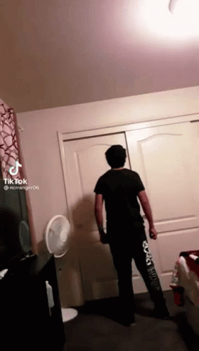 Paglalarawan ng Content: a man in a black shirt is standing in a room with a fan .