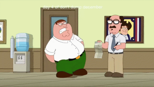 Paglalarawan ng Content: peter griffin stands next to a man holding a piece of paper that says day 4 of don t dump december