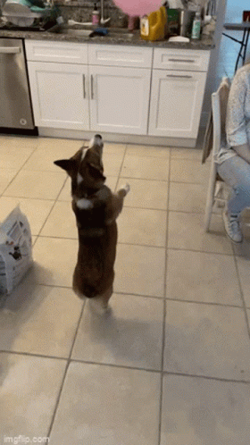 Paglalarawan ng Content: a dog is standing on its hind legs in a kitchen while a woman sits at a table .