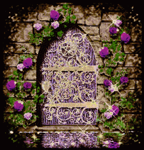Paglalarawan ng Content: a picture of a door with purple roses surrounding it and the letter g on it