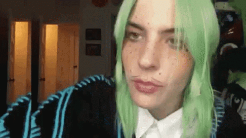 Paglalarawan ng Content: a woman with green hair and freckles is wearing a black and blue sweater .