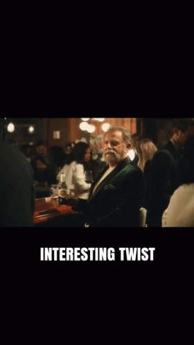 Paglalarawan ng Content: a man in a tuxedo is sitting at a bar with the words " interesting twist " above him