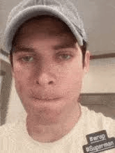 Paglalarawan ng Content: a man wearing a hat and a white t-shirt is making a funny face .