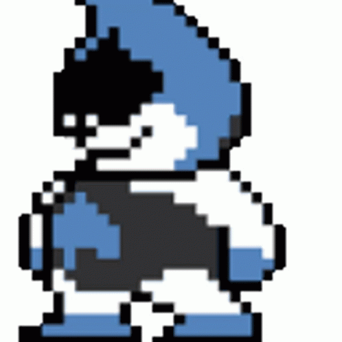 Paglalarawan ng Content: a pixel art of a gnome with a blue hat and a black and white outfit .