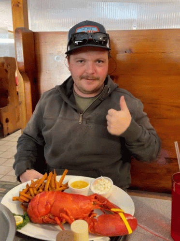 Paglalarawan ng Content: a man giving a thumbs up while sitting at a table with a plate of lobster and french fries