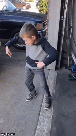 Paglalarawan ng Content: a young boy is dancing in front of a garage door .