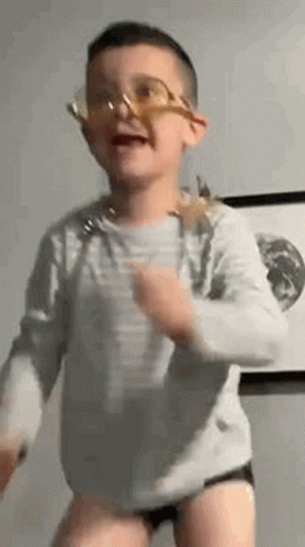 Paglalarawan ng Content: a young boy wearing sunglasses and underwear is dancing in front of a picture .