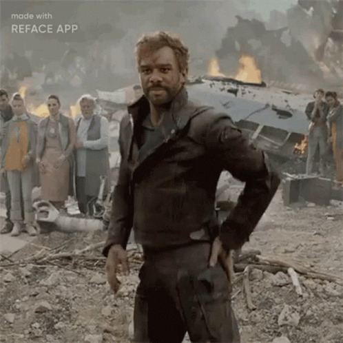 Paglalarawan ng Content: a man with a beard is standing in front of a group of people in a destroyed city .