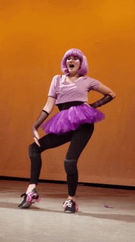 Paglalarawan ng Content: a woman wearing a purple tutu and roller skates stands on a stage
