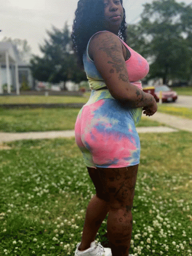 Paglalarawan ng Content: a woman in a tie dye outfit stands in a field