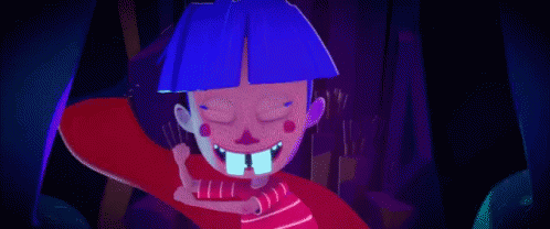 Paglalarawan ng Content: a cartoon character with blue hair and a red shirt is dancing in a dark room .