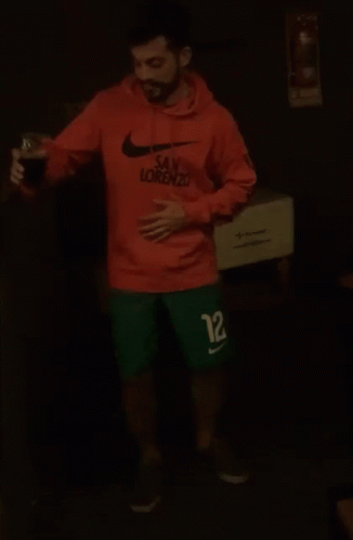 Paglalarawan ng Content: a man wearing an orange nike hoodie and green shorts is holding a drink