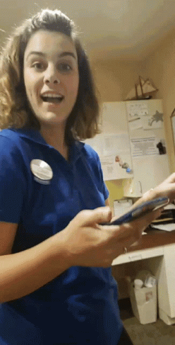 Paglalarawan ng Content: a woman in a blue shirt with a name tag on her shoulder holds a cell phone