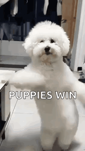 Paglalarawan ng Content: a small white dog is standing on its hind legs with the words puppies win written above it .