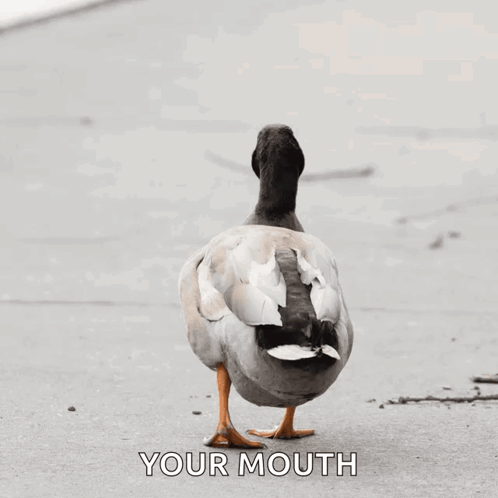 Paglalarawan ng Content: a duck is standing on a sidewalk with the words " your mouth " below it