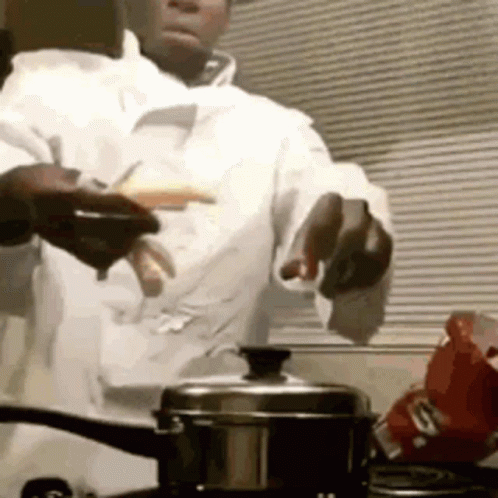 Paglalarawan ng Content: a man in a chef 's coat is cooking food in a pot on a stove .