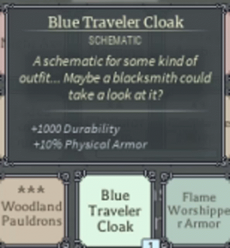 Paglalarawan ng Content: a blue traveler cloak is a schematic for some kind of outfit maybe a blacksmith could take a look at it