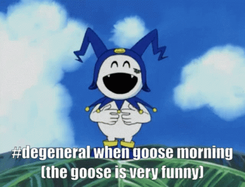 - Paglalarawan ng Content: a cartoon of a jester with the words " degeneral when goose morning ( the goose is very funny ) "