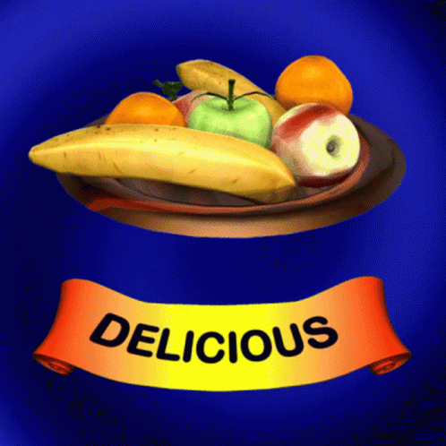 Paglalarawan ng Content: a plate of fruit with a banner that says " delicious "