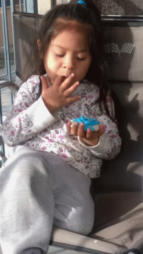 Paglalarawan ng Content: a little girl is sitting in a chair eating a blue cupcake