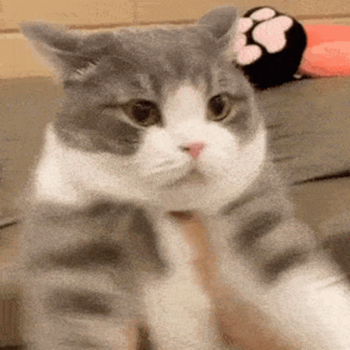 Paglalarawan ng Content: a gray and white cat is sitting on a couch with its paws up .