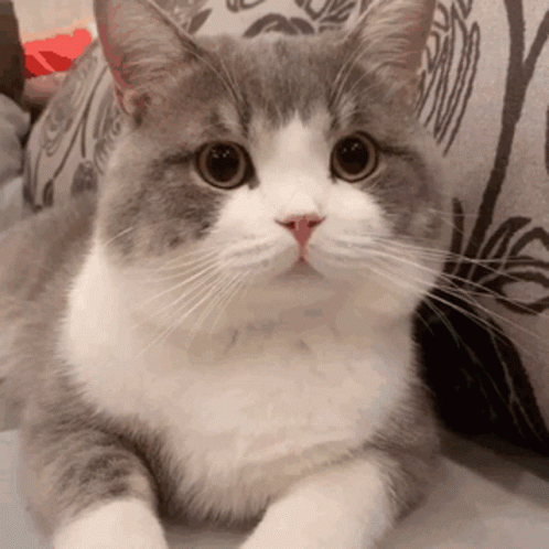 Paglalarawan ng Content: a gray and white cat is laying down on a couch and looking at the camera