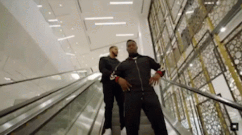Paglalarawan ng Content: two men are walking down an escalator in a building .