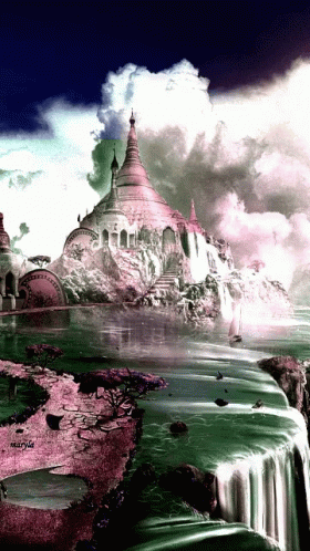 Paglalarawan ng Content: a painting of a waterfall and a castle with a clock on the top