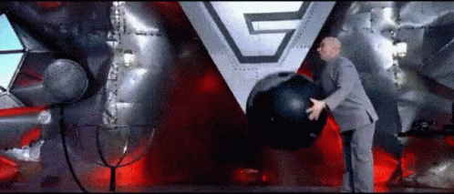 Paglalarawan ng Content: a man in a suit is holding a large black ball in front of a metal wall with the letter e on it .