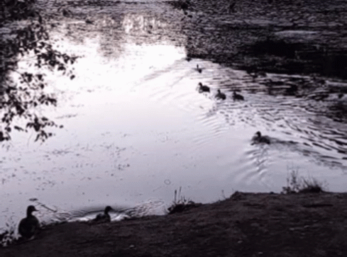 Paglalarawan ng Content: a black and white photo of ducks in a river