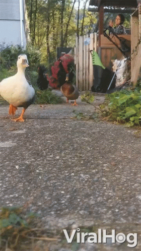 Paglalarawan ng Content: a group of ducks standing on a sidewalk next to a woman in a stroller and a sign that says viralhog