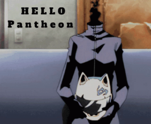 Paglalarawan ng Content: a cartoon character is holding a mask in front of a sign that says " hello pantheon "