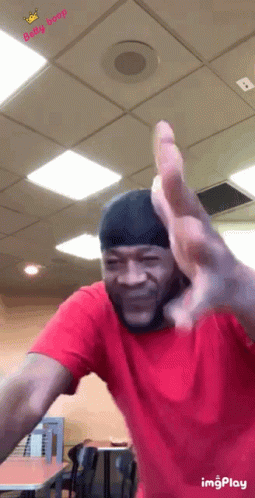 Paglalarawan ng Content: a man in a red shirt is giving a high five with a crown on the ceiling