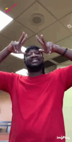 Paglalarawan ng Content: a man in a red shirt making a peace sign