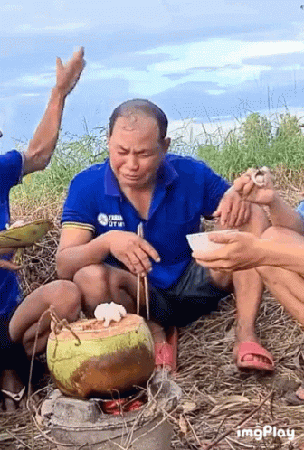 Paglalarawan ng Content: a man in a blue shirt that says yamaha sits on the ground eating food