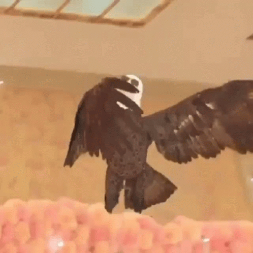 Paglalarawan ng Content: a bald eagle with its wings outstretched is standing on a pile of flowers .