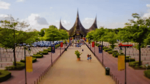 Paglalarawan ng Content: a blurred image of people walking down a path in front of a large building
