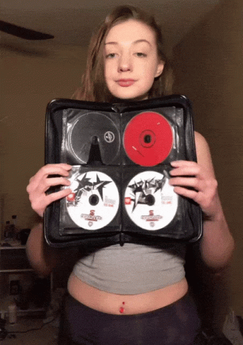 Paglalarawan ng Content: a girl is holding a binder full of cd 's including one that says ' sonic the hedgehog 2 '