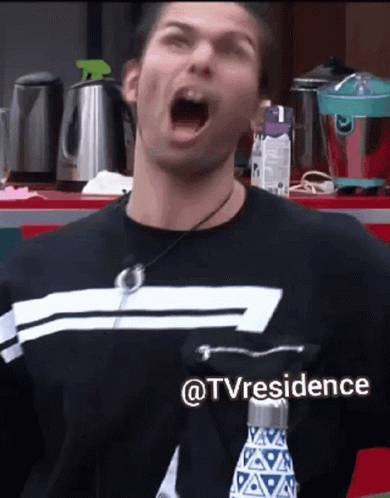 - Paglalarawan ng Content: a man wearing a black shirt with a white stripe on it is screaming in a kitchen with the words @tvresidence below him