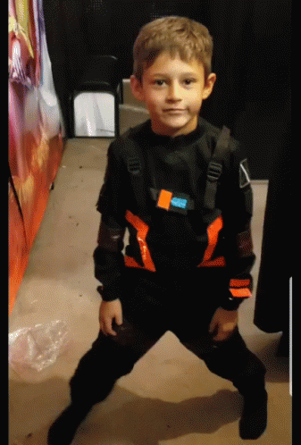 Paglalarawan ng Content: a young boy wearing a black and orange jumpsuit with a backpack that says ' a ' on it